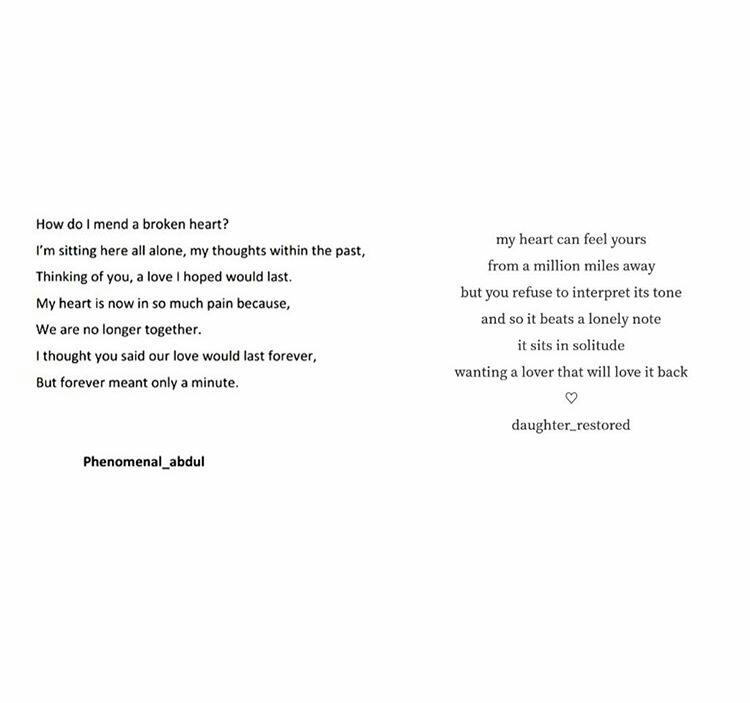 Hi everyone this collab is a piece centered around heartbreak and the lonely emotions that come with it. Collaborating with Avianna was so nice. She’s a pleasure to work with and such a talented writer. You can follow her on Instagram to see more of her works @daughter_restored.