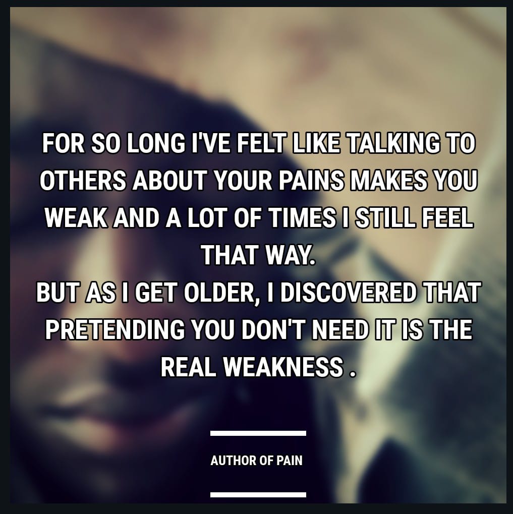 Sometimes I feel like asking for help from people and making them conscious about the traumas surrounding you makes them see you as weak, they see people who don’t ask for help and people who are always smiling as strong. When someone has this mindset, it is humane for the person to stop asking others for help and try to face his demons alone, but truly that’s the real weakness. You pretending you don’t need help or someone to talk to is the real weakness and you might not notice it till it becomes too late. But it’s also true that we are not to ask for help from everyone, not everyone cares enough for you to give you a solution that will be best for you, sometimes it’s even best we talk to people we don’t know, because there is a big difference between your friends and your friends who really care and are able to stand with you no matter what you’re going through. I had alot of people that I could always confide in and talk to, but I noticed that not all of them really cared. Some just saw me as someone who doesn’t like to be happy, someone who loves pain, and they were not ready to stand by me, gone are the days when I fought for friendships, now I know those who care and those who doesn’t. In other to stay strong, it is compulsory we ask for help from others, but know who you talk to. If you feel like none of your friends will be willing to listen to you, then it’s best you talk to others you don’t know and there are lot of ways doing that. You can meet someone for the first and only time in your life, but the advice that person gives you, if followed will lead you to greater places through out your life. You can meet and talk to someone you don’t know on social medias, you can create a form asking for help and share it, no one will know you created the questions in the form, but you get your answers at the end. Having someone you can talk to at anytime, about your day, or anything about yourself without feeling like you are being clingy or boring is one of the greatest feelings ever. – AUTHOR OF PAIN